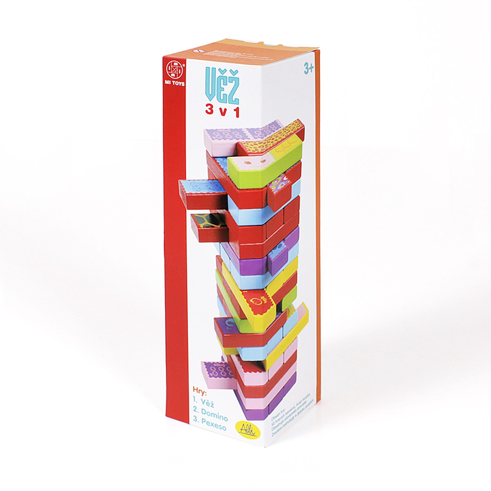 Věž 3v1 je variabilní hra pro děti od 3 let. S barevnými dřevěnými kameny můžete stavět klasickou věž (známou též jako jenga), ale kameny lze použít také na domino a pexeso.
