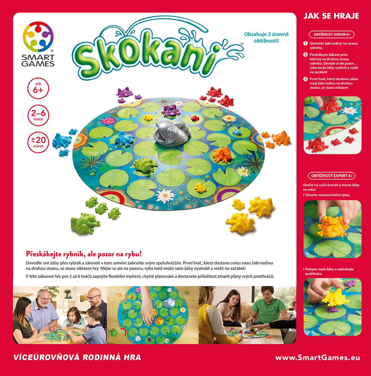 Skokani jsou chytrá hra od SMART Games, v níž se snažíte žabí rodinku přepravit na druhou stranu rybníka. Hra obsahuje dvě úrovně pravidel, přičemž pokročilá verze obsahuje vtipný moment, kdy může malá žabka skočit na záda té větší, případně ta větší může malou cizí žabku polapit.