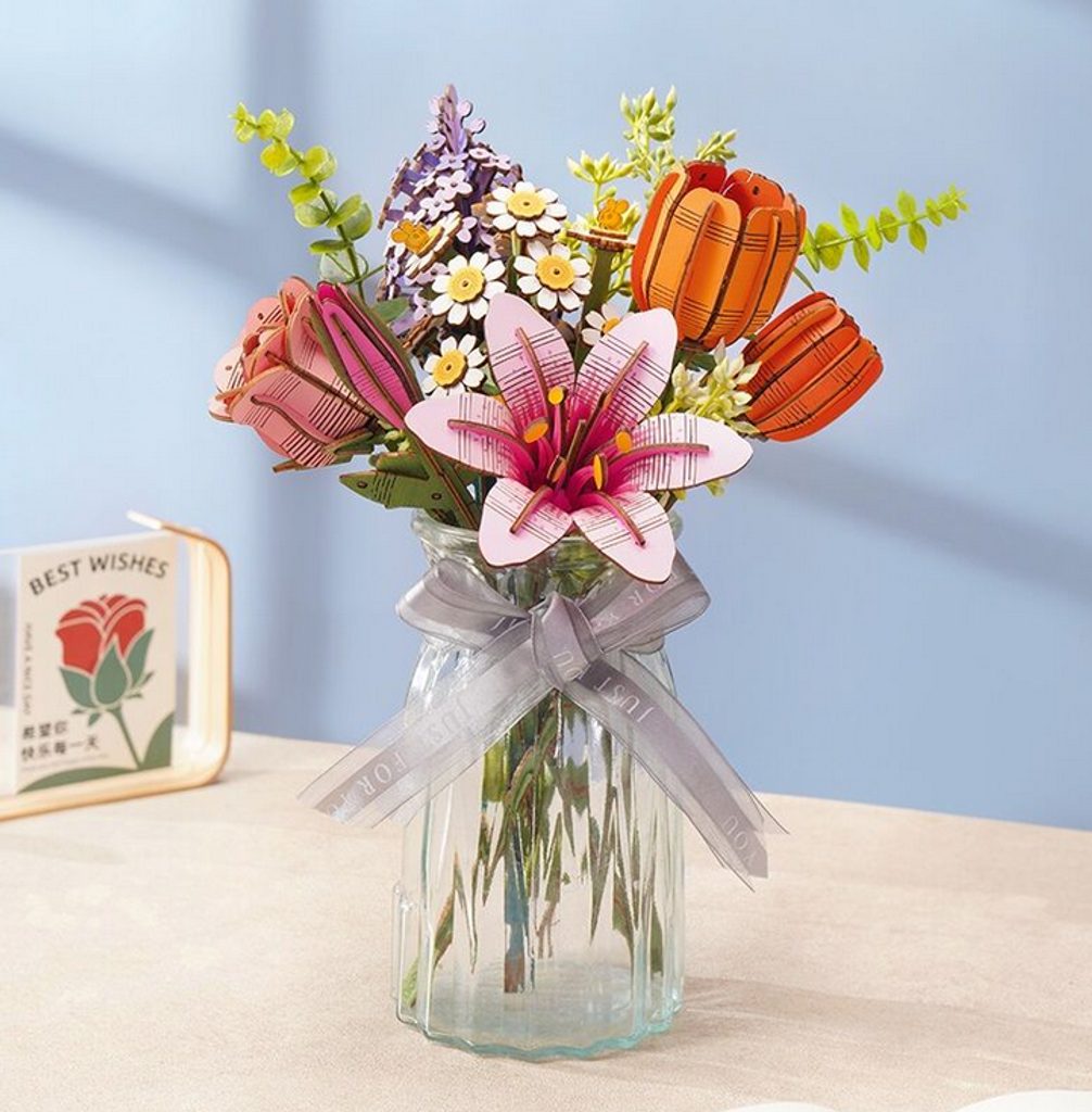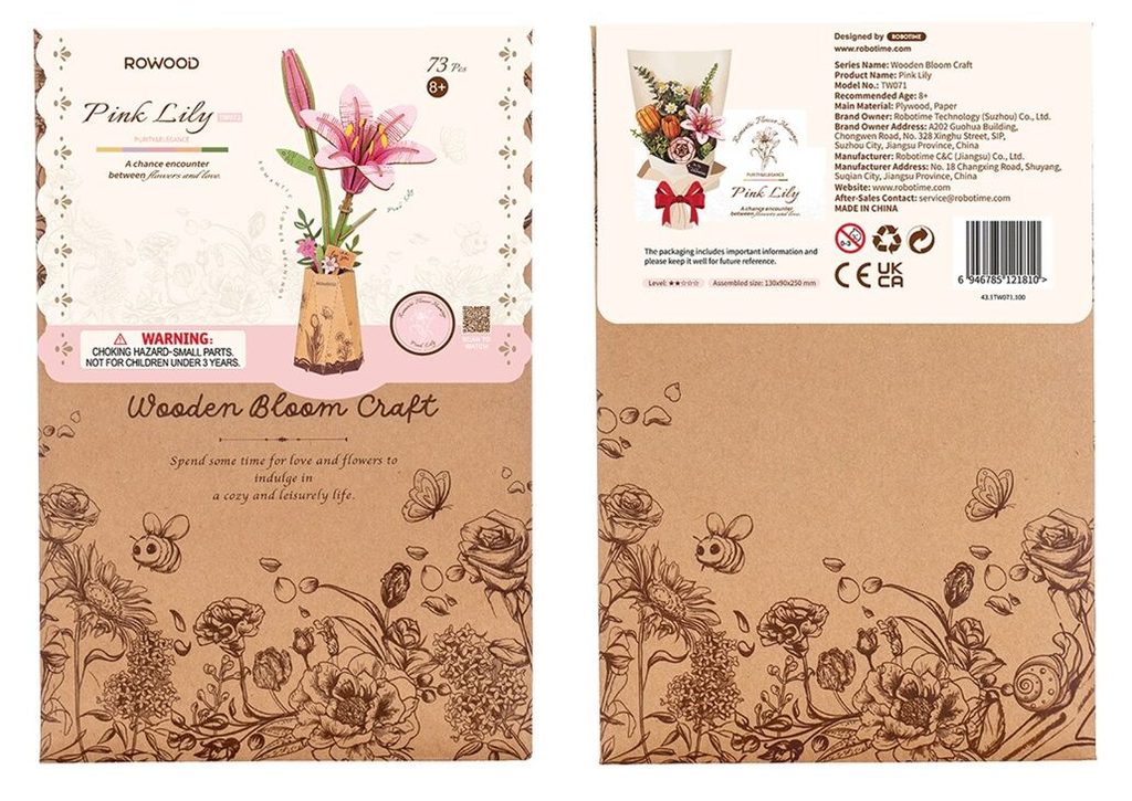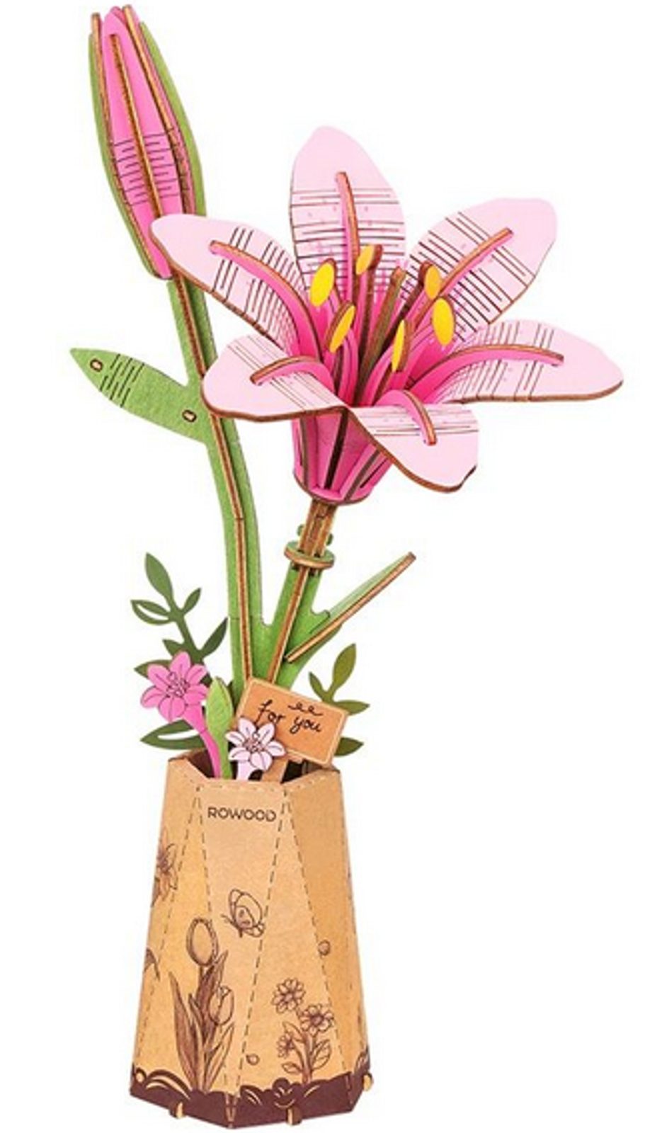 Dřevěné 3D Puzzle Růžová lilie o velikosti 73 dílků.