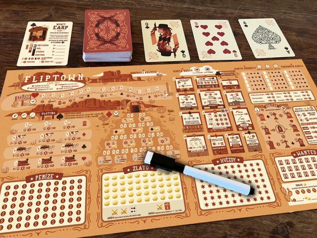 Fliptown je hra typu flip and write, ve které se snažíte získat hvězdy prozkoumáváním města divokého západu. Hra využívá standardní pokerový balíček k řízení hry ve stylu otevřeného světa spolu s mazatelnými deskami, které slouží jako mapa každého hráče.