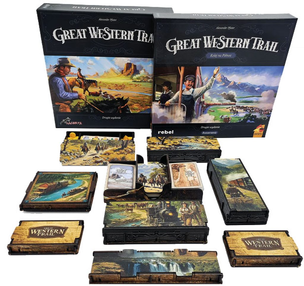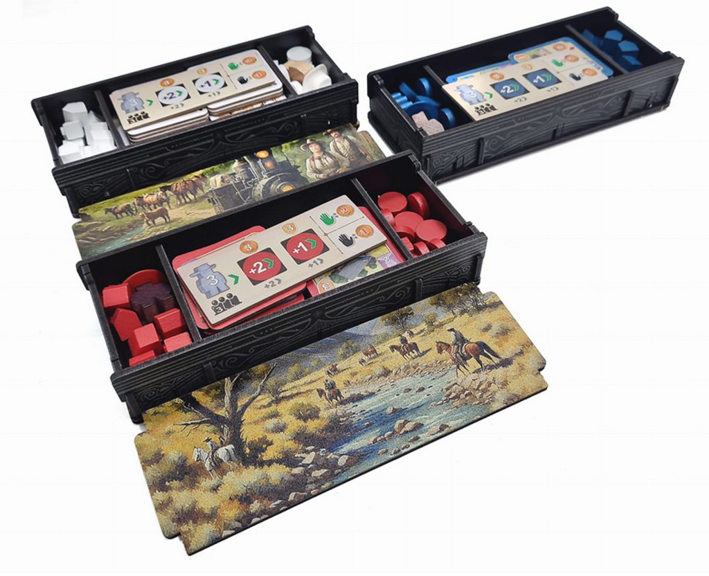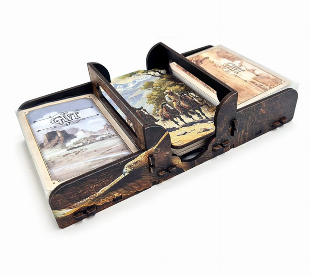 Vymazlený insert od firmy e-Raptor pro hru Great Western Trail Second Edition a rozšíření Rails to the North. Všechny komponenty mají své místo, insert počítá s obalenými kartami.