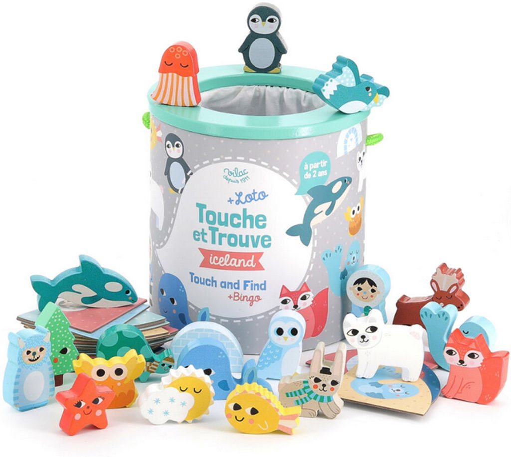 Hmatej a najdi ve variantě Iceland je krásně zpracovaná hra, která rozvíjí často opomíjený smysl dětí - hmat. Dřevěné figurky jsou ukryty v kyblíku vyloženém látkovým sáčkem. Mladší děti mají za úkol hmatem rozpoznat, které předměty se v něm nacházejí, ty starší mohou zapojit obrázkové karty a zahrát si loto či bingo.
