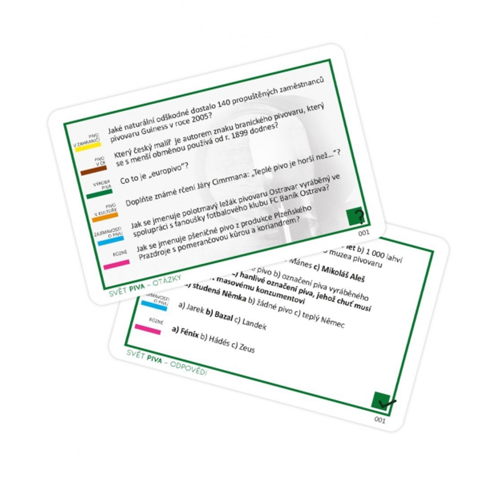 Kvízy do kapsy jsou poutavé a zábavné karetní vědomostní otázky na cesty nebo perfektní rozšíření základní verze hry Česko - Otázky a odpovědi. V každém balíčku Kvízů do kapsy najdete 50 karet s otázkami rozdělenými do šesti tematických okruhů. Ke každé z 300 otázek máte k dispozici na výběr ze tří možných odpovědí. Ve hře naleznete 300 otázek rozdělených do šesti tematických okruhů: Pivo v zahraničí, Pivo v ČR, výroba piva, Pivo v kultuře, Zajímavosti a Různé.