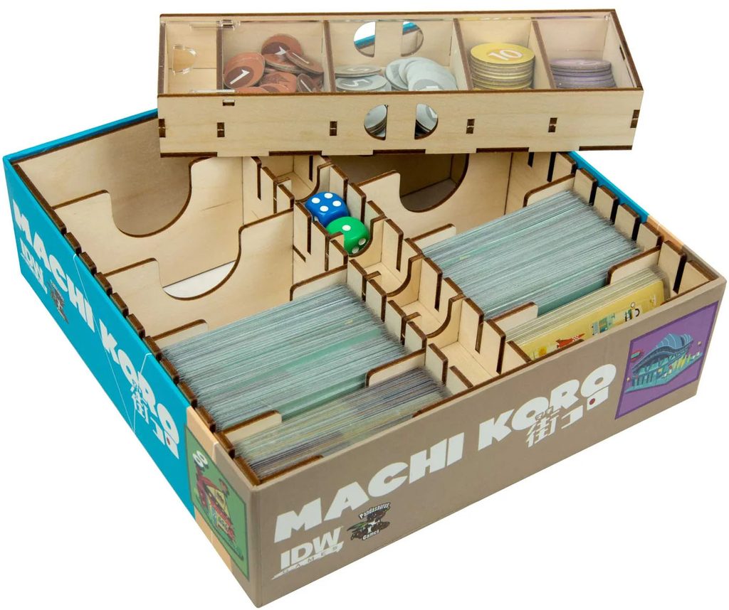 Dřevěný insert pro hru Machi Koro nebo Machi Koro: Bright Lights, Big City a rozšíření Harbor a Millionaire's Row. Insert poskytuje dostatek prostoru pro obalené či neobalené karty, vyvýšenou část na kostky a vyjímatelnou krabičku na mince s akrylovým víkem.