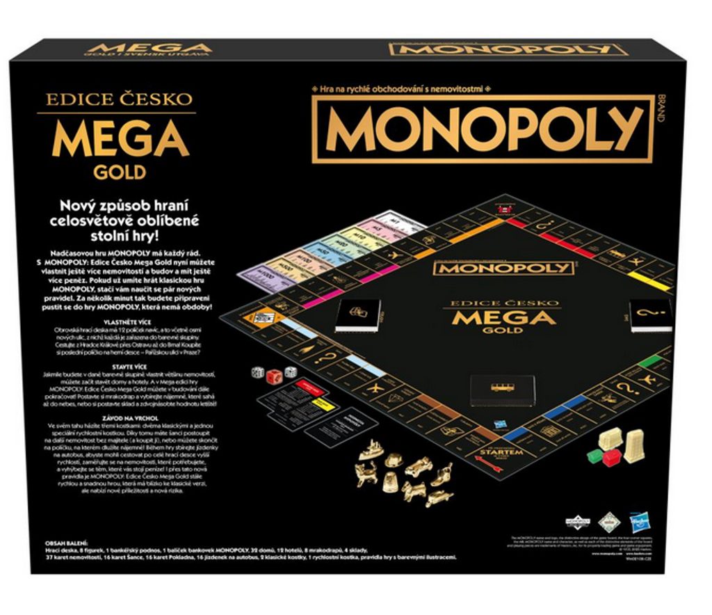 Každého, kdo miluje Monopoly zajisté potěší, že tato jedinečná MEGA Gold edice Česko vám umožní investovat ještě více, stavět ještě výš a nashromáždit ješt větší hromady peněz.