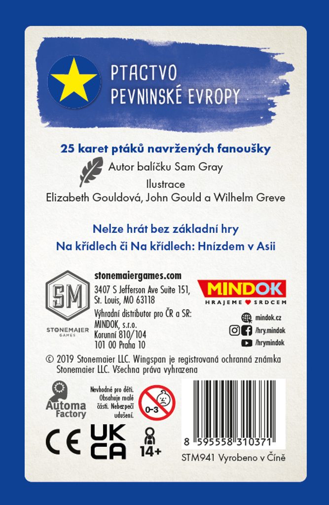 25 nových ptáků pro hru Na křídlech, které najdete primárně na pevninské Evropě. Tento region sice již byl obsažen v základní hře, karty ptáků jsou ale unikátní.