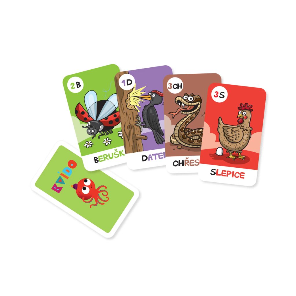 Písmenkové kvarteto z edice Kvído je karetní hra s krásnými ilustracemi, která děti od 5 let naučí naši abecedu.