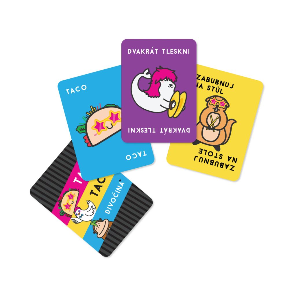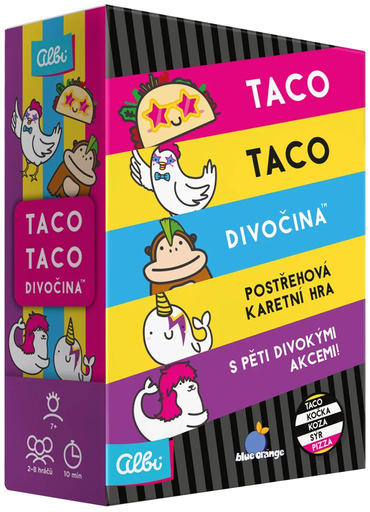 Taco, taco, divočina je taková šílenější verze postřehové hry Taco, kočka, koze, sýr, pizza. Taco je tu totiž divoké, zatímco zvláštní karty nikoliv... tedy pokud se neobjeví dvě za sebou. Užijte si zběsilé herní tempo na párty i s rodinou a dětmi od 7 let.