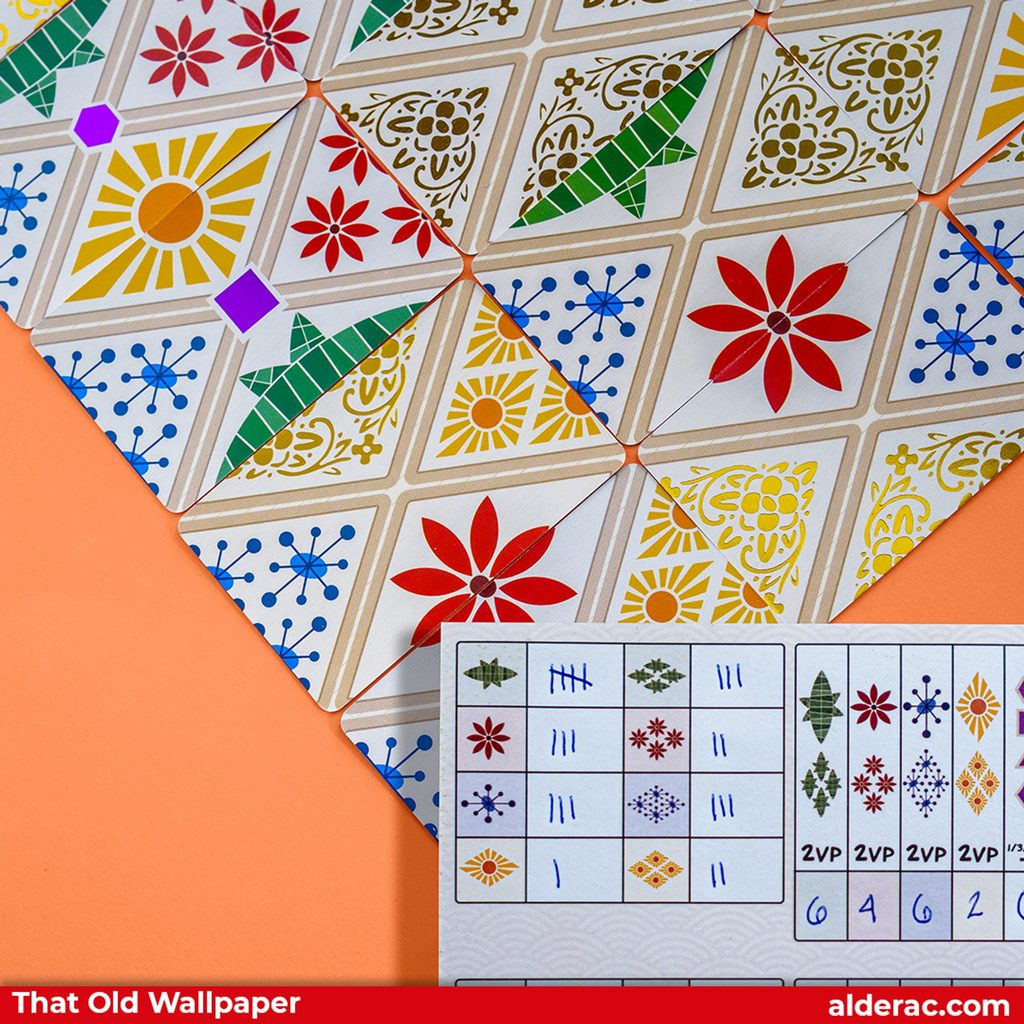 Jak dostanete své karty tapet, musíte je ihned přiložit k vašim již zahraným kartám, ideálně tak, abyste spojily poloviny různých vzorů. Ty jsou zde ve čtyřech barvách, přičemž každá barva je ještě ve dvou velikostech. Je tu i "žolíkový" vzorec, který teda vypadá trochu divně, ale co už. Ke konci kola na každé místo dejte novou kartu tapety, takže ve výsledku na některých pozicích bude pravděpodobně více karet než na jiných.