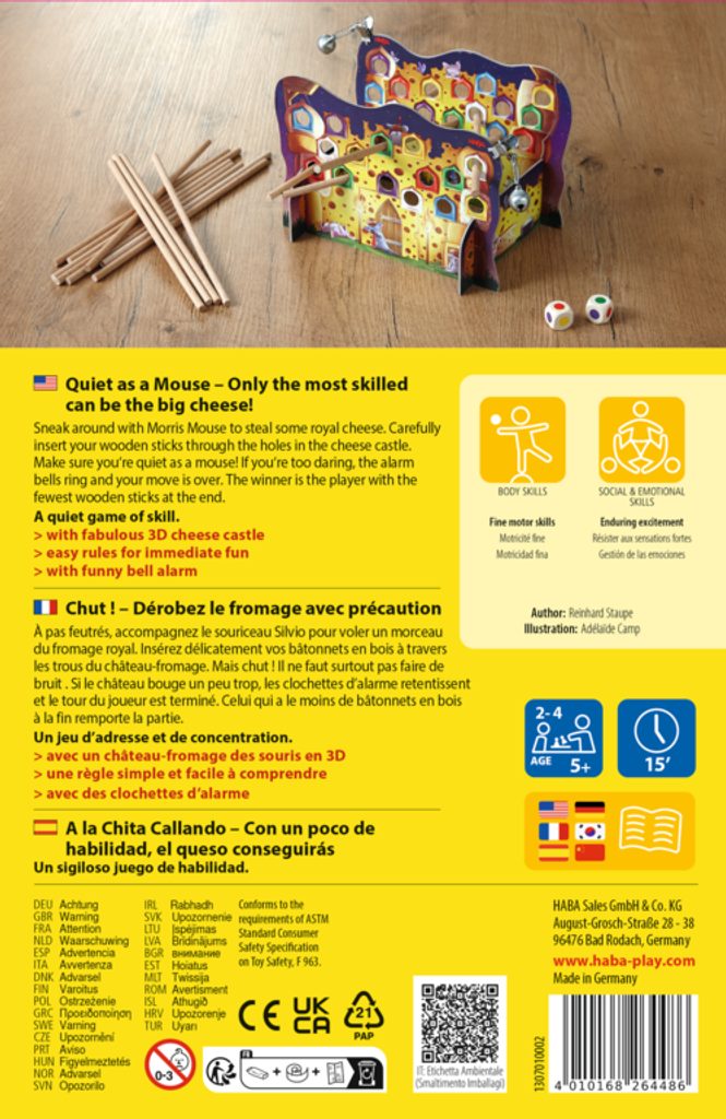 Pokuste se prostrčit dřevěné tyčky otvory sýrového hradu, aniž byste zavadili o další tyčku. Pokud budete příliš zbrklí, rozezníte rolničky a váš tah končí. Všichni však musí být tiší jako myšky, aby zvonění rolniček nepřeslechli.
