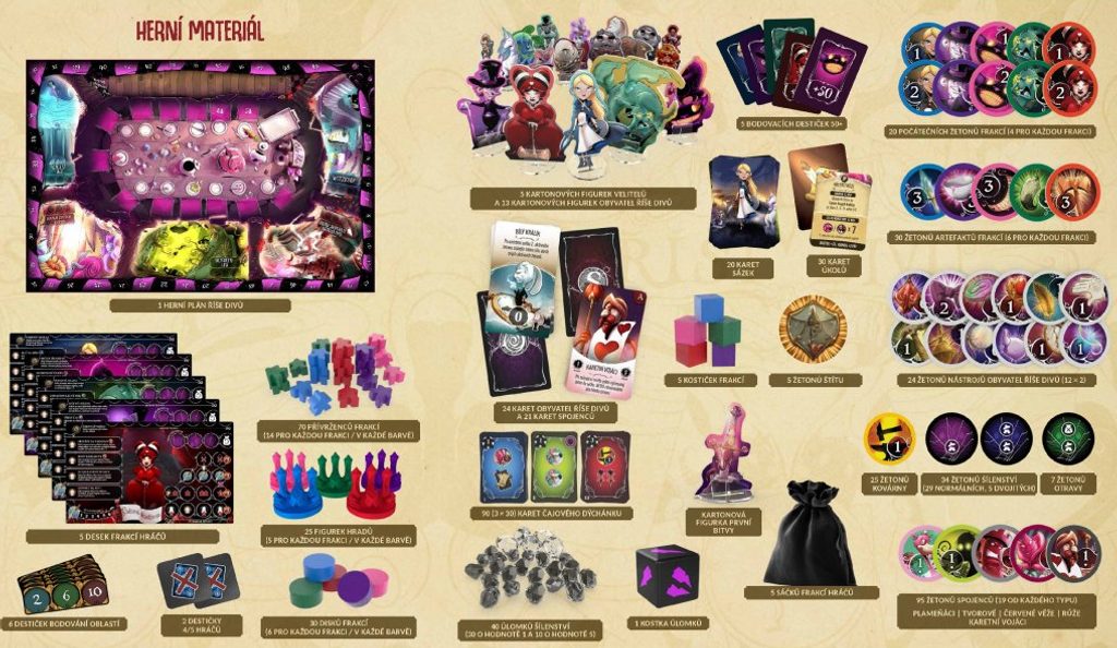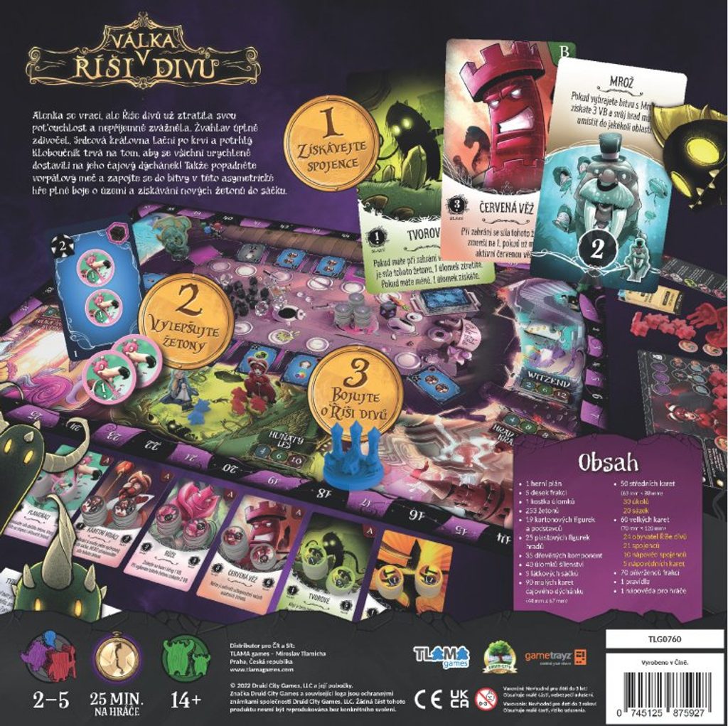 Alenka se vrací, ale Říše divů už ztratila svou poťouchlost a nepříjemně zvážněla. Tlachapoud úplně zdivočel, Srdcová královna lační po krvi a potrhlý Kloboučník trvá na tom, aby se všichni urychleně dostavili na jeho čajový dýchánek. Takže popadněte vorpálový meč a zapojte se do bitvy v asymetrické hře Válka v Říši divů plné boje o území a získávání nových žetonů do sáčku.