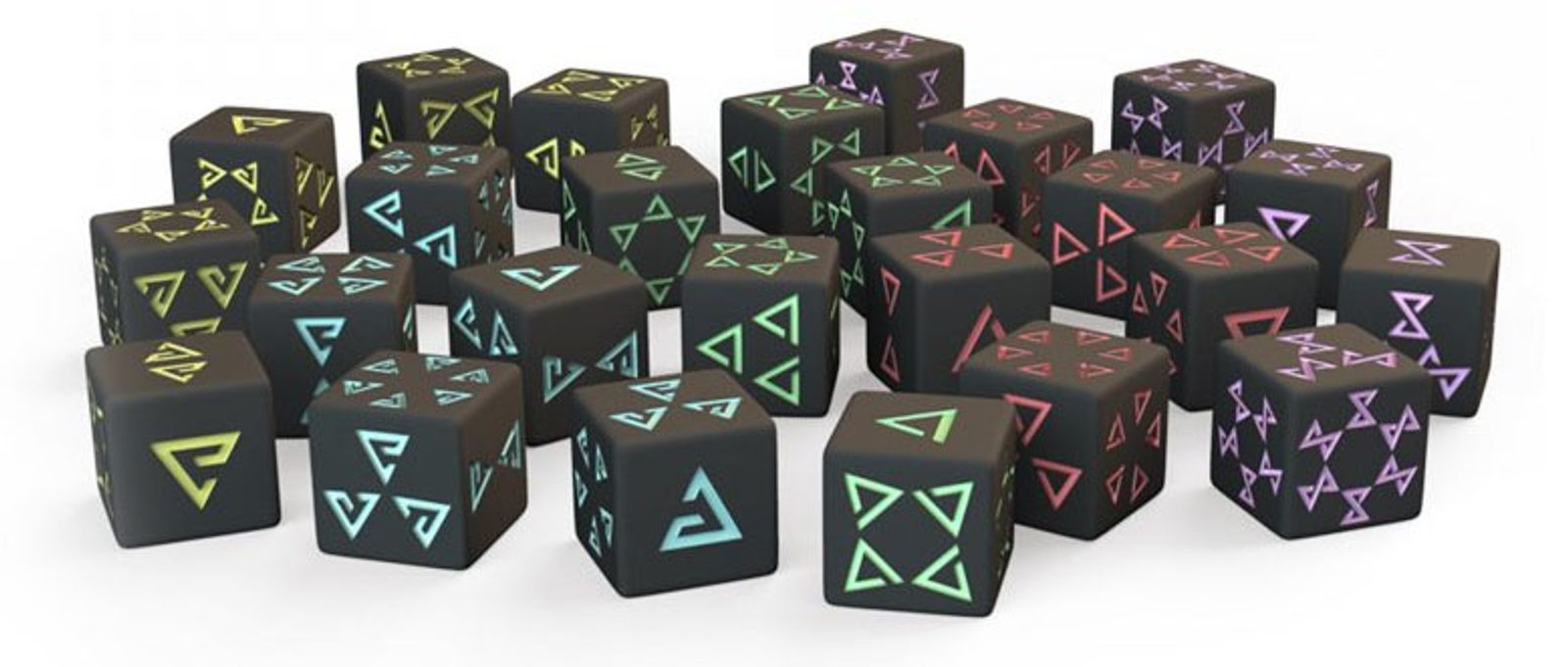 Sada 5 kostek pro každého hráče v jeho unikátní barvě pro hru Zaklínač: Starý svět. Kostky mají jiný design než v základní hře.