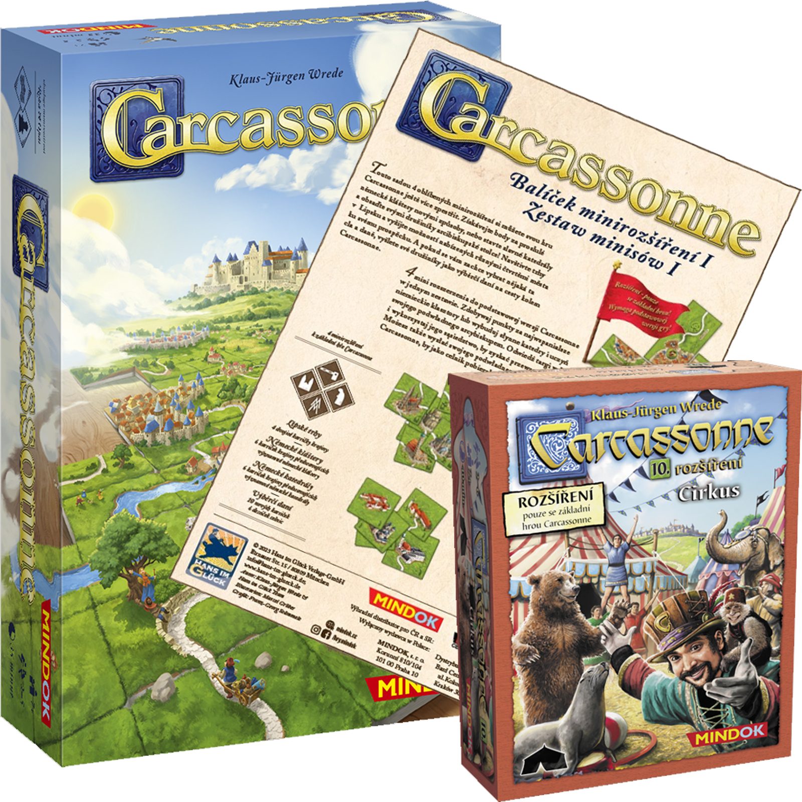 Zvýhodněná sada základní hry Carcassonne, rozšíření Cirkus (2017) a Balíčku Minirozšíření.